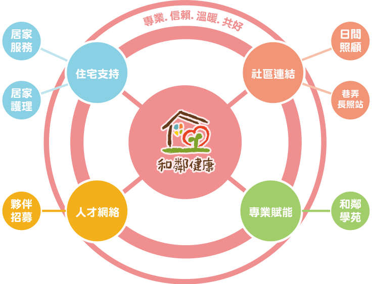 和鄰成立於2017年, 由2位護理師發起,協同一群專業護理師所成立 包含居服夥伴、護理師、營養師、職能/物理、社工師...等 服務據點為新北市各區,是完整的社區照顧整合單位, 包含長照A、B、C級單位及健保居家照護服務 使命為協助需要者在最適合的地方過最適的生活!